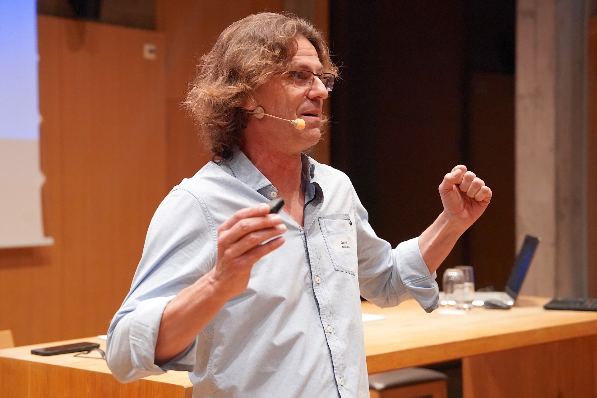 Wenn der Teufner Unternehmer Daniel Niklaus die Bühne betritt, begeistert er mit seiner positiven Ausstrahlung, seinem Optimismus und seiner Authentität ab Beginn. Er begann von seinem «18 jährigen» Ich zu berichten, und erzählte von vielen seinen Stationen in seinen ungestümen und vielseitigen Unternehmertätigkeiten. Schon in der Schule wurde im klar, ihm etwas beizubringen war schwierig, er wusste, er musste sich Neues, selber beibringen, ein Autodidakt ist er geblieben und wird dies mit grosser Neugierde auch zukünftig sein. Er ging auf viele Stationen seiner Laufbahn ein, von seinem Büro in Teufen bis hin zu seinem Surfcamp in Kalifornien, wo er jährlich bis zu 2 Monaten seinen «American Dream» auslebt.